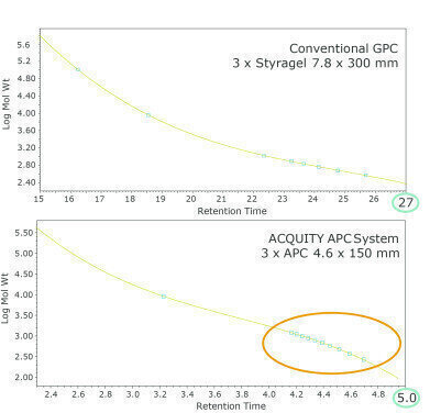通常情况下,一系列的标准运行获得校准曲线的点。与传统GPC、平衡、准备和分析每个标准可能需要数小时的天。结果,校正可能不是经常和结果可能是基于一个“老”校准。ACQUITY APC系统,平衡快得多,由于低系统住体积和运行时间更短由于使用较小的粒子在高流速。缩短运行时间允许平衡和校准很容易在一小时内完成。最后,有额外的分辨率,更少的标准可能需要准备和注射来获得一个健壮的可用于校准曲线。