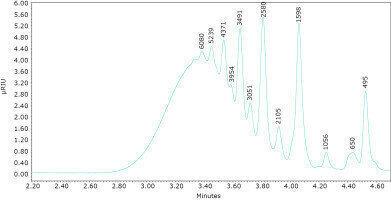 样品分析时,更大的鲁棒性校准允许更高的信心低分子量低聚物的分子量决定。环氧树脂的分析样本相对于聚苯乙烯校准标准如图3所示。的结果显示分辨率低聚物的运行时间不到五分钟使用三个ACQUITY APC XT 4.6×150毫米列系列。