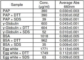 皮尔斯660 nm化验是受到某些干扰物质包括离子SDS等洗涤剂。这是由这个试验的结果证实,SDS显著降低样品的吸光度。离子洗涤剂兼容性试剂可作为添加剂使用样本含SDS的工具包。浓度的试验不受德勤影响测试的结果所示,这是与样品没有德勤补充道。